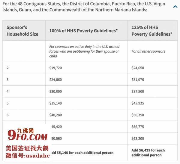 如果申请人收入不够上述要求,其存款、股票、房产等其他资产也可做补充,但至少是差额的5倍。如果还是财力不达标,就需要寻找符合资质的共同担保人才能满足申请要求,共同担保人需完成一份独立的I-864表格并提供相应的证明文件。HHS每年会公布贫困线标准,标准会每年有变化。