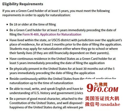 美国签证找大鹤解答:如果是普通绿卡申请入籍,需要5年时间,且满足以下条件